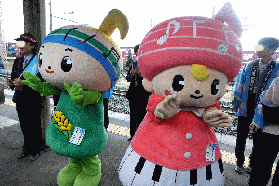 東北本線の路盤と合流して(路線の区分としては、水郡線は安積永盛駅までである)、そして終着の郡山には、定刻の13時49分に到着した。たくさんの係員やゆるキャラに迎えられて、今回の観光列車は終了である。