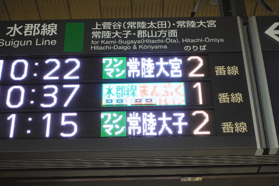 しばし駅周辺で時間を潰してから、係員がいる改札を通った(切符がないため)。行先案内では、「まんぷくトレイン」とカラフルに表現されている。
