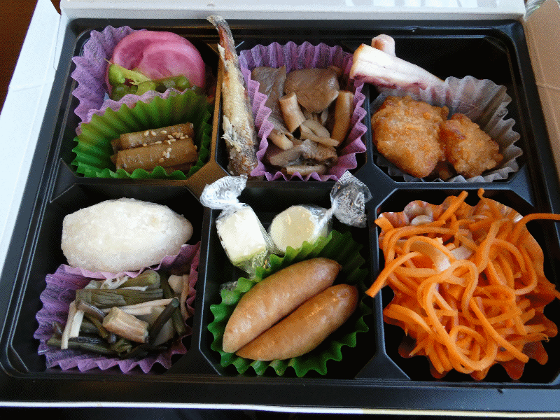 待つことしばし、やっと1段目の弁当がやって来た。パンフレットによると、「伊達鶏からあげ・いか一夜干し・いか人参・きのこミックス・メヒカリからあげ・キャンディーチーズ・ウインナー・赤かぶ漬・相馬胡瓜漬・海老芋の揚げ出し・山菜漬」という内容である。