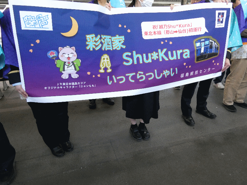 JR東日本の観光列車「越乃Shu*Kura」(行先によって「ゆざわShu*Kura」や「柳都Shu*Kura」になる日もある)は、主に新潟地方で運行されている列車であるが、今回は上述のキャンペーンに伴い、福島県内で運行されることになったものである。4月13日に会津紀行Shu*Kura(喜多方→郡山)と彩酒家Shu*Kura(郡山→仙台)、14日に福島あづまShu*Kura(仙台→郡山)、15日に会津紀行Shu*Kura(郡山→喜多方)となっていたが、私は14日から「プチ移住」シリーズで福岡に行くことになっていたため、選択肢は13日だけである。昼に呑むよりは夜に呑んでそのまま寝る方が好きなので、仙台行の彩酒家Shu*Kuraを申し込み、仙台のホテルと翌朝の新幹線も押さえておいた。