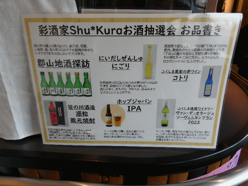 今回の食事付き観光列車は、JR東日本の「彩酒家Shu*Kura」であり、前回の「水郡線まんぷくトレイン」と同様に「福島デスティネーションキャンペーン」として運行されるものである。彩酒家は、「いざかや」と読むとの由。