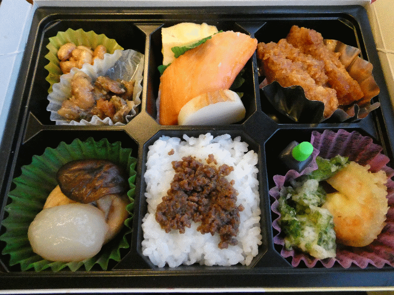 続いてやって来たのが、2段目の弁当である。パンフレットによると、「ソースカツ、菜の花天ぷら、むき海老天、玉子焼、焼鮭、焼かまぼこ、白飯(牛肉そぼろトッピング)、まめみそ、くるみ味噌、煮物(がんも、玉こん、しいたけ)」である。