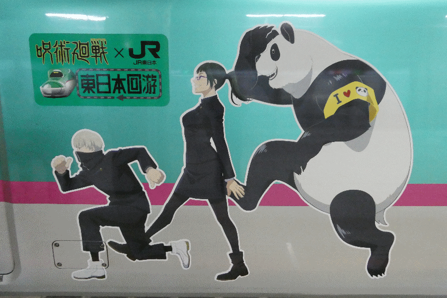 ホームで待っていると、入線してきたのは呪術廻戦とのコラボでラッピングされた車両であった。私が乗った自由席のイラストは、このような感じであった。