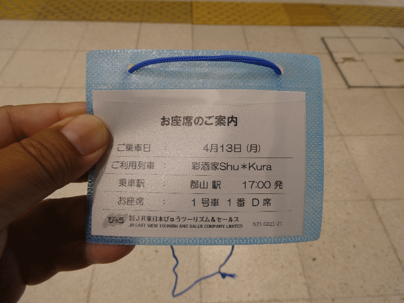 16時を過ぎていたので、受付をするために改札付近に向かった。渡されたのは、切符を兼ねる名札だけである。座席番号を頼りに座席を検索してみると、意外にもボックス席であった。相席必須であるが、詳細は乗車してからの確認である。
