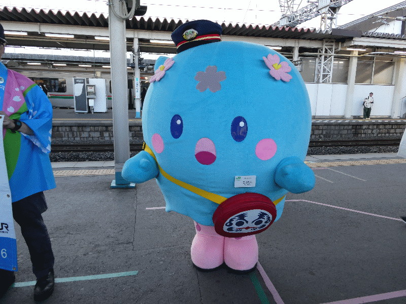 ホーム上には見送りの駅員が増えてきて、デビューしたてだという郡山駅のゆるキャラ「こりたん」もスタンバイである。