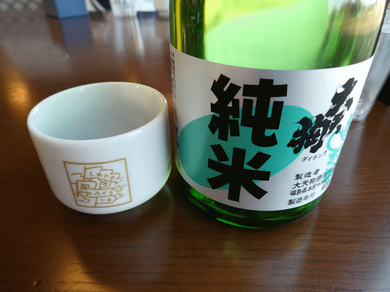 最初に配布されたのが、大天狗酒造の純米酒(300ml)である。福島DCキャンペーンのロゴが入ったお猪口も、続いて配布された。
