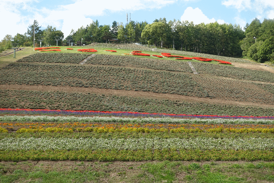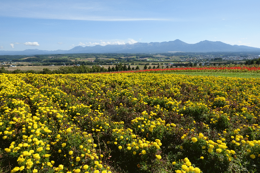 だいぶ疲れてきたが、更に45分ほど歩き続けて、やって来たのが「フラワーランドかみふらの」である。今日は本当に天気が良く、十勝岳連峰連邦が良く見えている。