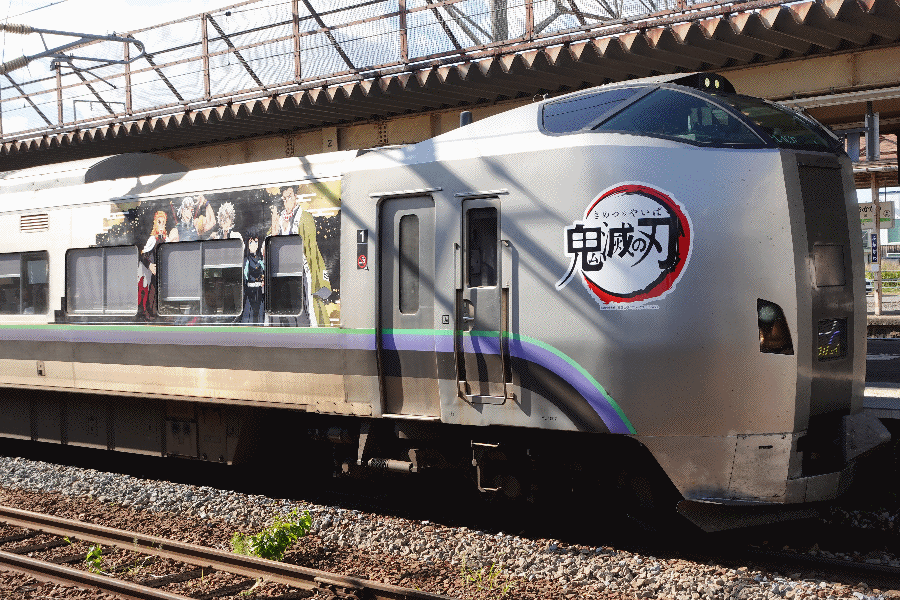 @向かいのホームには「鬼滅の刃」柄が入線してきた