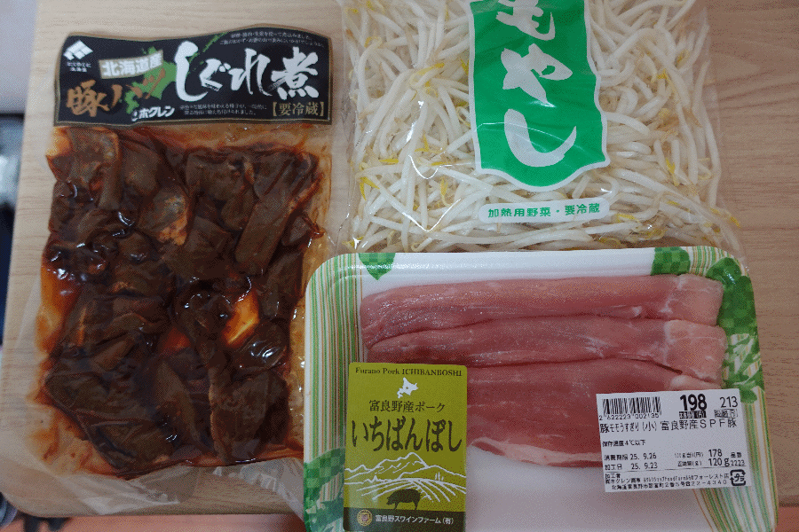 ツマミについては美唄焼き鳥を確保しているが、それだけでは足りないと思い、ホクレンの「豚ハツしぐれ煮」を買い、焼きそば調理用として富良野産豚肉ともやしを買っておいた。
