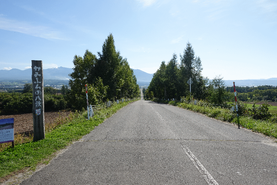 そこから歩くこと約50分、パノラマロード江花に到着した。朝なので逆光になってしまっているが、まっすぐの坂道から十勝岳連峰が見通せる場所である。