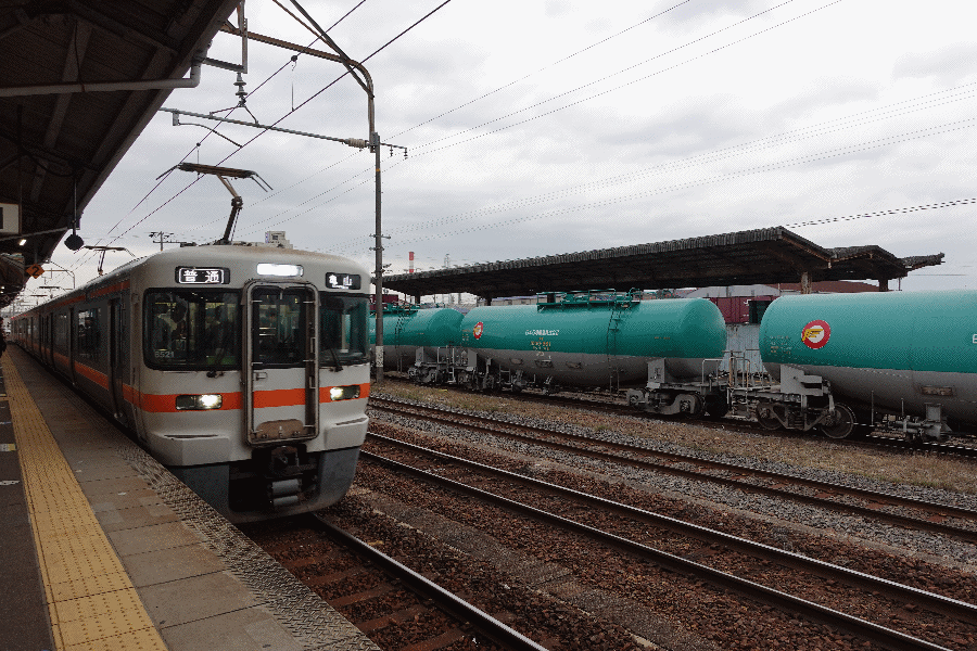 四日市はコンビナートがあるため、貨物列車が多く、貨車が係留されている。今日の旅は、7時19分発の各駅停車から始まる。