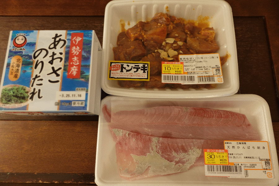 早速近場のスーパーへ行き、地物の刺身(カンパチ)や納豆を買って来た。四日市と言えばトンテキが有名であるため、四日市滞在初日からトンテキである。