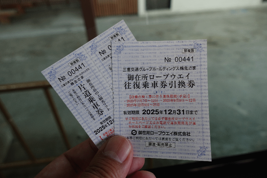 御在所ロープウェイは往復で2,600円もするし、その先のリフトまで乗るとさらに700円が必要である。しかし私はネットオークションで、双方が利用できる株主優待券を1,300円+送料で買ってあるため、お得に乗ることができる。