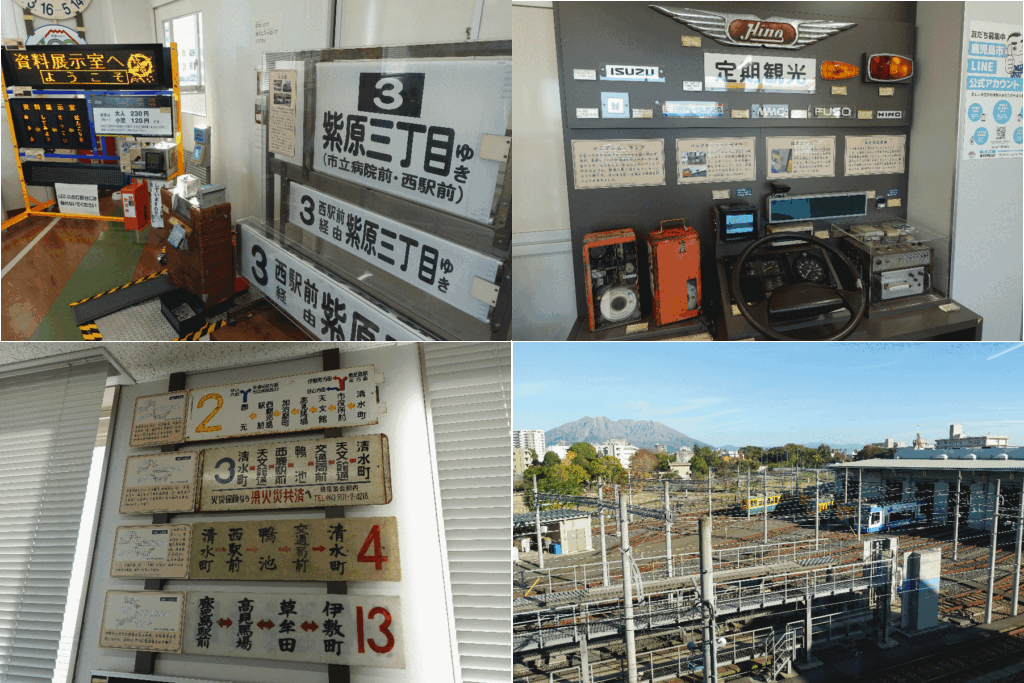 すぐ近くには鹿児島市交通局の本社があり、その3階には市バスと市電の資料館があるのである。1階で記帳をして、その部屋に向かった。幕回しや音声案内など、実際に動かせるものも多く、そして外は車庫全体が見渡せるようになっていた。