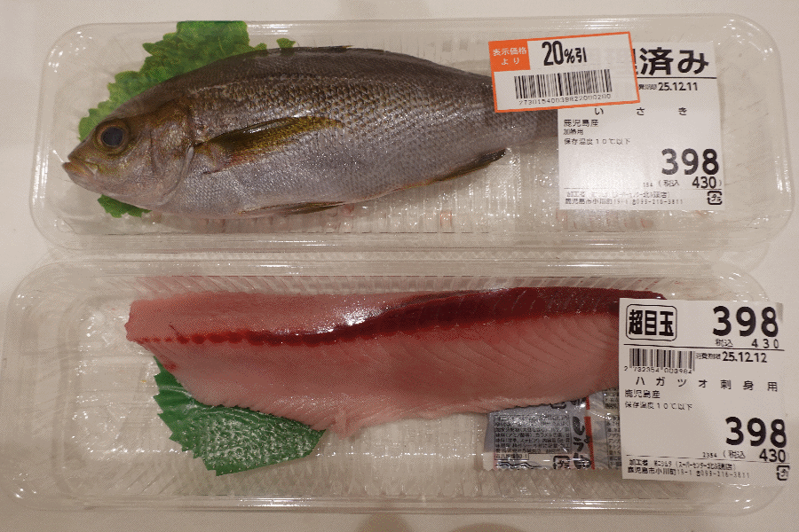 しかしそこで、鹿児島産のハガツオと割引になっているイサキを発見してしまった。ハガツオはサワラの仲間であり足が速いため、首都圏ではなかなかお目に掛かれない。ということで、午前に買った手羽先や豚肉は明日に回すことにして、今晩はこれらに決定である。