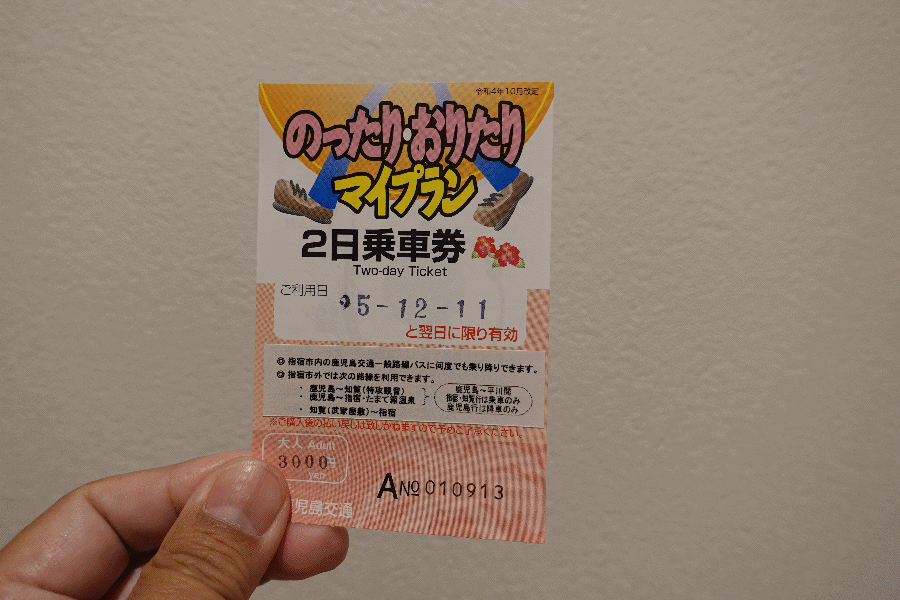 今日からの2日間は、「のったり・おりたりマイプラン」の2日乗車券を利用してのバス旅となる。この乗車券は知覧や指宿方面のバスが乗り放題であり、また鹿児島市内からの往復も付いている(日帰りで2回往復しても良いが、鹿児島市の特定の区域は、往路は乗車のみ復路は下車のみしかできない)。