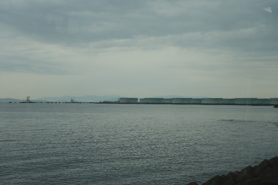 8時38分、金生町を出発した。鹿児島市内を通り、五位野を過ぎた辺りで左手には大きく海が見えてきた。その先には、大規模な石油の備蓄基地が見えている。快晴であればすばらしい景色であろうが、残念ながら今日の天気予報は「曇り時々雨」である。
