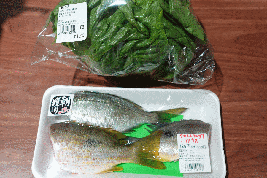20分強歩いて、道の駅に到着した。刺身などが安く売っているが、まだ11時過ぎであるため持ち歩くのは不安である。そこで横を見ると、小さいとはいえ3匹でたった200円の朝どれ魚があったので、山川産のレタスと共に購入してみた。