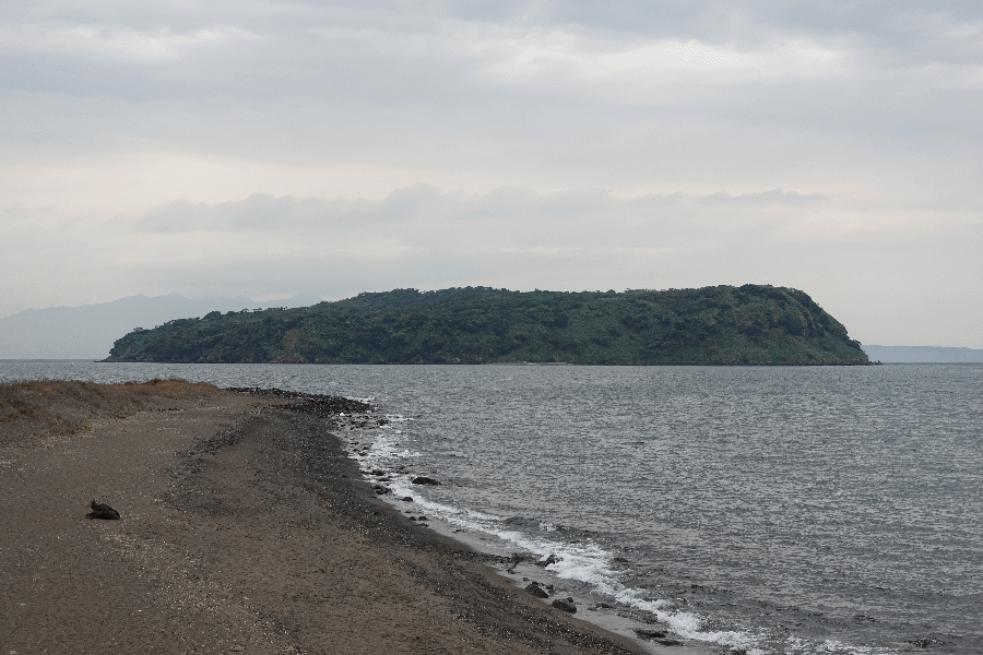 指宿の街中を通り過ぎて、12時に終点に到着した。そこから数分歩いて見えてくるのが、知林ヶ島である。季節や潮流によっては歩いて渡れる島であるが、今日はすべて海に囲まれている状態であった。