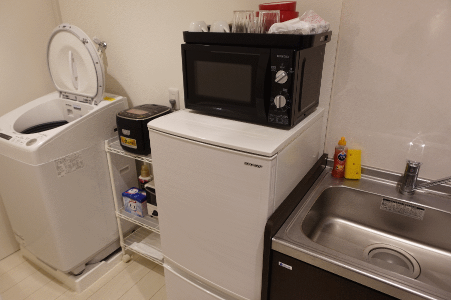 事前にメールで送られてきた暗証番号を使って、ホテルに入った。キッチンはもちろん、部屋内にレンジや炊飯器まであり、過去最高に自炊水準を高くできそうである(乾燥ができる洗濯機や洗剤まである)。