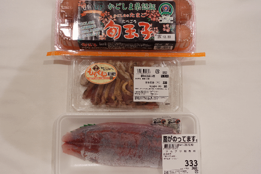 荷物を整理してから、近場にあるスーパーへと向かった。このシリーズで恒例となった地元の卵と、鹿児島産の刺身(ツムブリ)と鳥のタタキである。