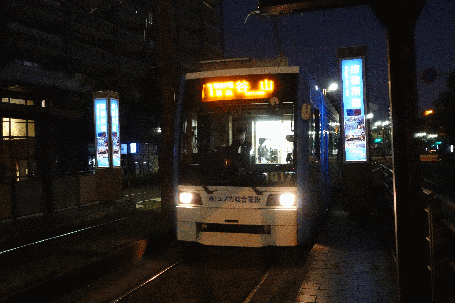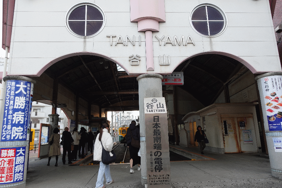 いったん谷山行に乗ったが、どうせなら中央駅方面にも行ってみようと思い、次の電停で下車して郡元行に乗り換えた。次第に明るくなり、郡元で谷山行に乗り換えて、終着の谷山までやって来た。ここは、日本最南端の電停(路面電車の駅)である。