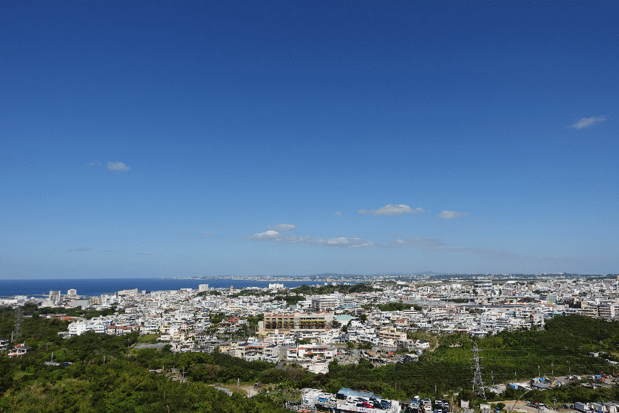 ひたすら歩いて駅に戻りモノレールに乗って、1駅で下車した。歩いて向かったのは、浦添城址である。石畳の道を歩いて登り、展望スポットへ向かった。