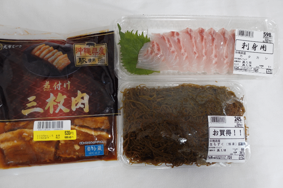 すぐ近くにスーパーがあったのでそこに入ってみて、カタカシの刺身を購入した。モズクについては料理の際に加える予定で(今晩のチャンプルーにも)、そしてご飯用として三枚肉(調理済み)も購入してみた。