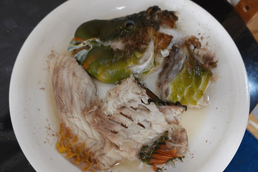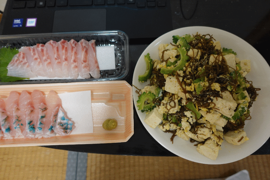 ホテルに戻り、夕食の準備である。モズクや卵で炒め物を作り、イラブチのお頭の調理である。タイのお頭と同じ調理(調理と言っても、ウロコを処理して料理酒をかけてレンチンするだけであるが)をしてみると、さすがスズキ目の魚だけあって、美味であった。タイよりウロコが大きいから処理もしやすいし、コラーゲン質の部分も多い感じであった。