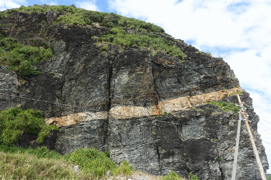 橋を渡って慶留間島に入り、ひたすら海岸線を歩き続けた。右手には、「これぞ地層」という岩板が露出している。