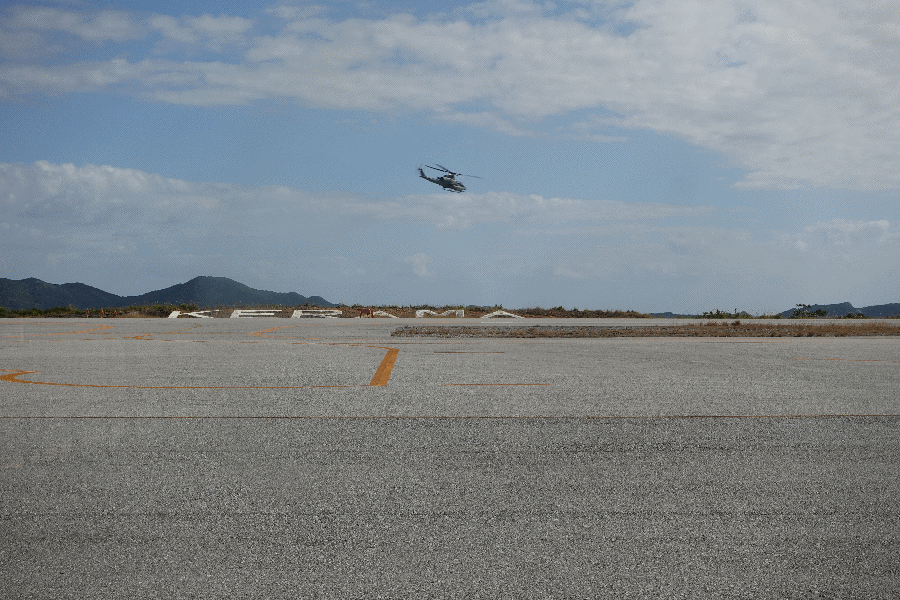 港からここまで歩いて45分くらいであったため椅子に座って休んでいると、ヘリコプターの音がバラバラと聞こえてきた。運が良いことにヘリタクシーが来たのかと思ったが、ヘリは滑走路を避けるようにして過ぎ去ってしまった。訓練飛行か何かであろうか。