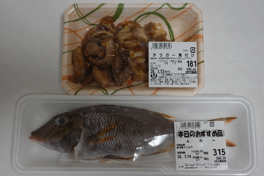 荷物を整理して、早速夜食材の確保である。すぐ近くにあるスーパーに行ってみると、ムルーという見慣れない魚があったので、買ってみることにした。沖縄らしいつまみ(チラガー)は、自炊が難しいため総菜で確保である。