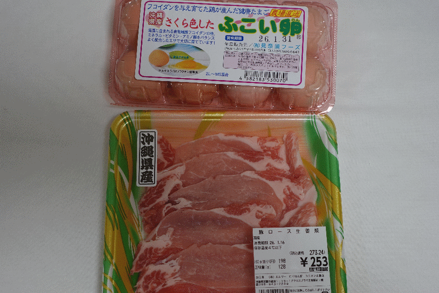 ご飯のお供としては、沖縄産の豚肉を買ってみた。また、このプチ移住シリーズでは恒例となっている、地の卵も確保である。