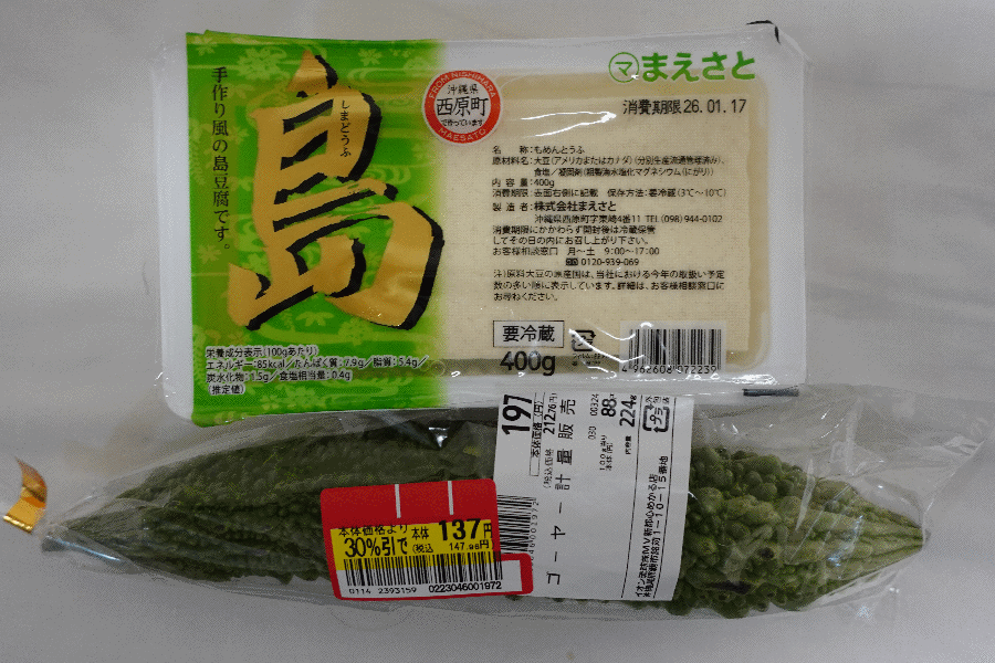ラッシュ時に移動したくないため部屋にいたが、暇である。近場の公園まで散歩に行き、その足で24時間営業のスーパーに行ってみた。すると地物のゴーヤが割引になっていたため、島豆腐と一緒に買ってみた。夜の一品は、これでチャンプルーに決定である。