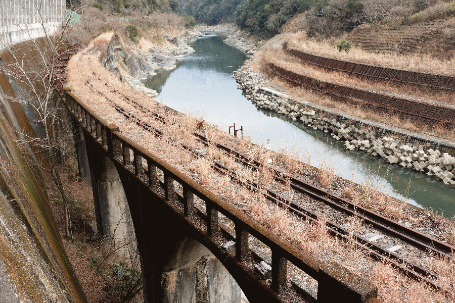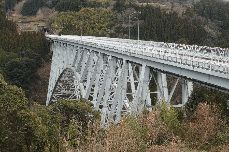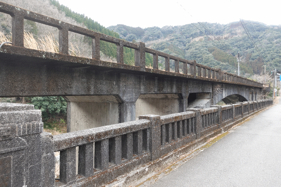 バイパスを走り続け、梁崎バス停を過ぎると旧道に向かって下り続け、最初のバス停である槇峰バス停で下車した。目の前にあるのが、重要文化財にも指定されている綱ノ瀬川橋梁である。