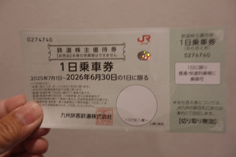 使用する切符は、JR九州の株主優待券である。九州全土で利用できるし、特急料金だけを支払えば特急も乗車可能である。例年6月になると値崩れして千円くらいになるが、今はまだ高い。ネットオークションで、4,800円+送料で落札してある。