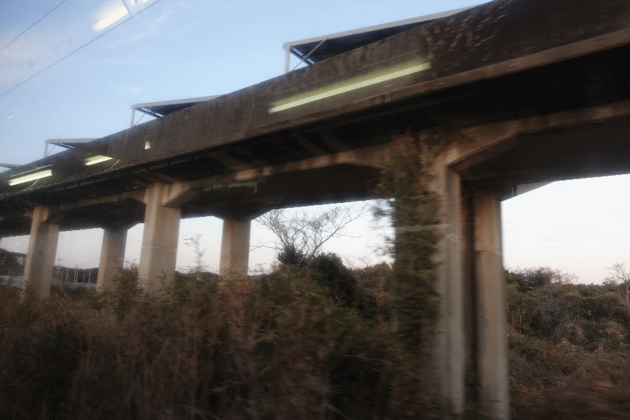 しばらくすると、右手に高架が見えて来る。これは以前にはリニアモーターカーの試験線として使われていたもので、今では廃墟(ソーラー施設の土台など)になっている。