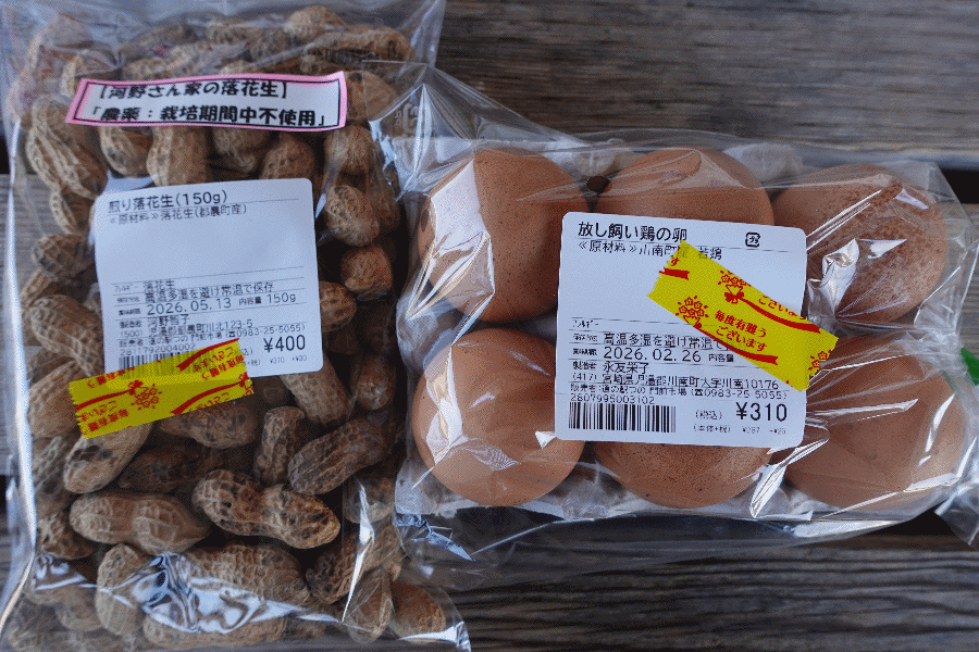 近くに道の駅があったので、地場の品を探して行ってみた。試食のトマトを食べたりして、最終的に購入を決めたのは、地元の落花生と放し飼い鶏の卵である。