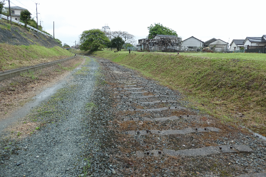 大牟田には世界遺産に指定された遺構もあるため、歩いて三池炭鉱の宮原坑へと向かった。そしてその手前で見えてくるのが、三池炭鉱の専用鉄道敷跡である。レールはすべて撤去されているが、コンクリート枕木のしっかりとした路盤である。