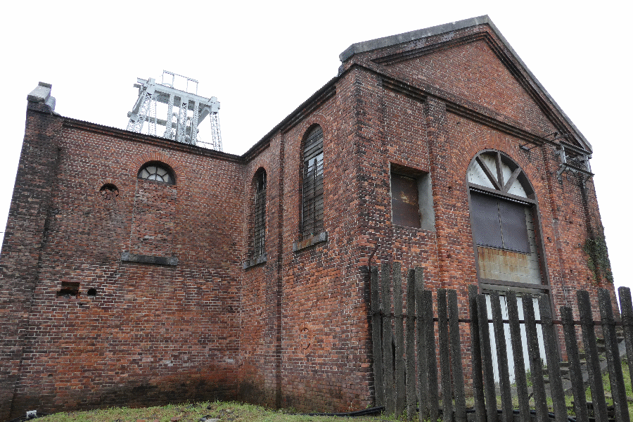 路盤跡の上を歩いて行くと、宮原抗が見えてきた。レンガ造りの古い建物であり、すぐ横には坑口のタワーが見えている。