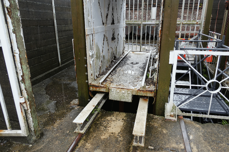 建屋に入って巻上機などを見ていると、人の気配に気づいた年配のボランティアの方が入ってきて、あれこれと説明をしてくれた(通常の入口から入ればその場で気付くらしいが、私は線路上を歩いて敷地の後ろから来たので、気付くのに遅れたらしい)。