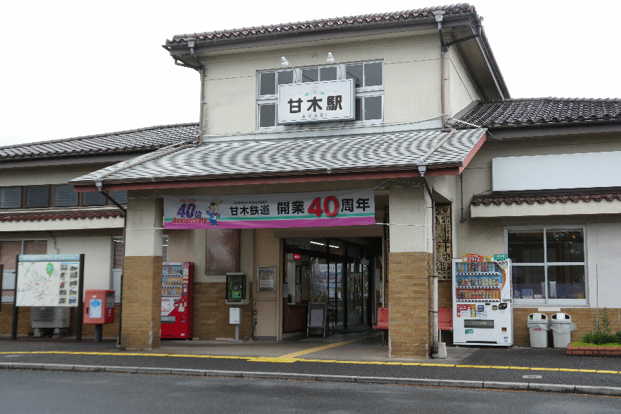 13時50分、甘木に到着した。そこから歩いて数分の場所にあるのが、甘木鉄道の方の甘木駅である。元は国鉄甘木線であり、分割民営化によって第三セクターとして運行を開始したものである。駅には「40周年」という横断幕があるが、国鉄分割民営化からもう40年かと思うと、感慨一入である。