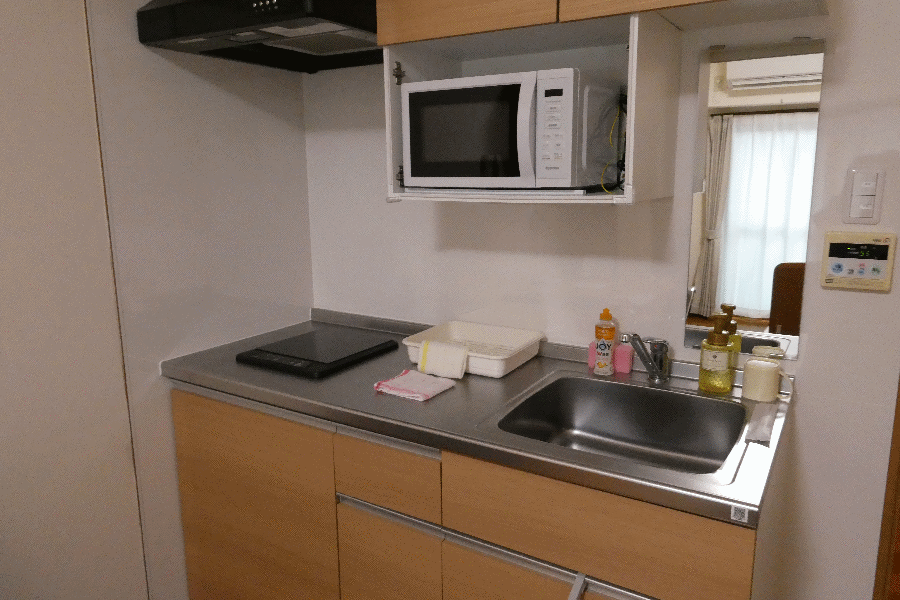 大雨の中を移動して、桜並木駅バス停で降りて、予約済のホテルに向かった。ウィークリータイプであり、もちろんキッチン完備である。