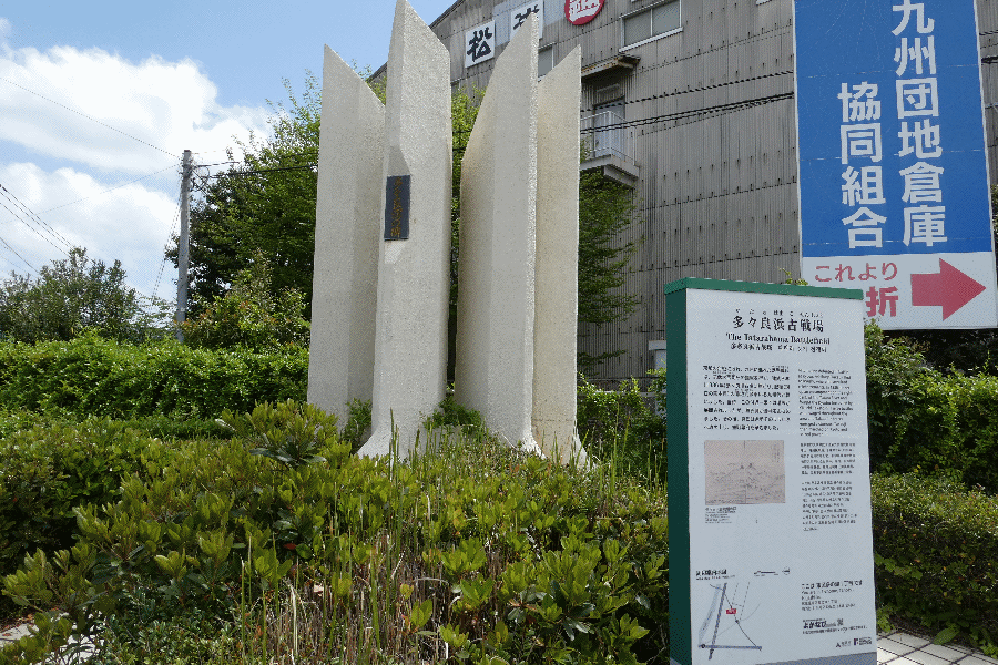 30分ほど歩き続けて、多の津バス停に辿り着いた。バスが来るまで時間があるためグーグルマップに調べさせると、近くに「多々良浜古戦場の碑」というのがあるというので、そこに行ってみた。