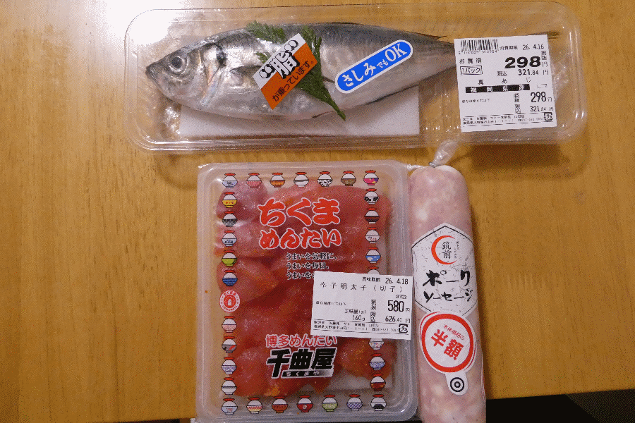 荷物を整理してから、スーパーへ向かった。福岡産のアジがあったので塩焼き用に確保して、また筑前ハムなるものが半額になったのでつまみ用として、そして福岡県であるから定番の品として明太子を買ってみることにした。