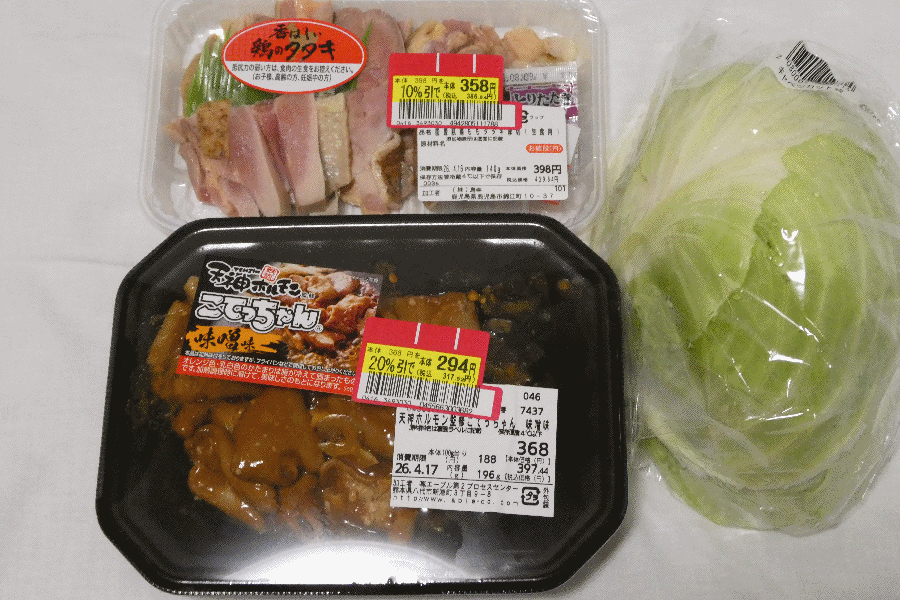 駅に併設して小さいスーパーがあったので、そこで九州っぽい鶏タタキと、天神ホルモンが割引になっていたので買い求めた。