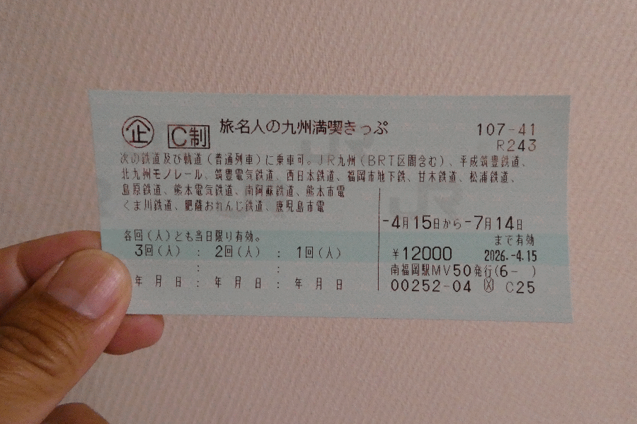 滞在中の移動手段については、12,000円の「旅名人の九州満喫きっぷ」(3日間有効であり、JR以外にも各種私鉄も乗車できる)と、10,000円の「SUNQパス北部九州版」(3日間有効)を組み合わせることにした。